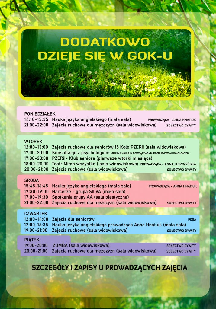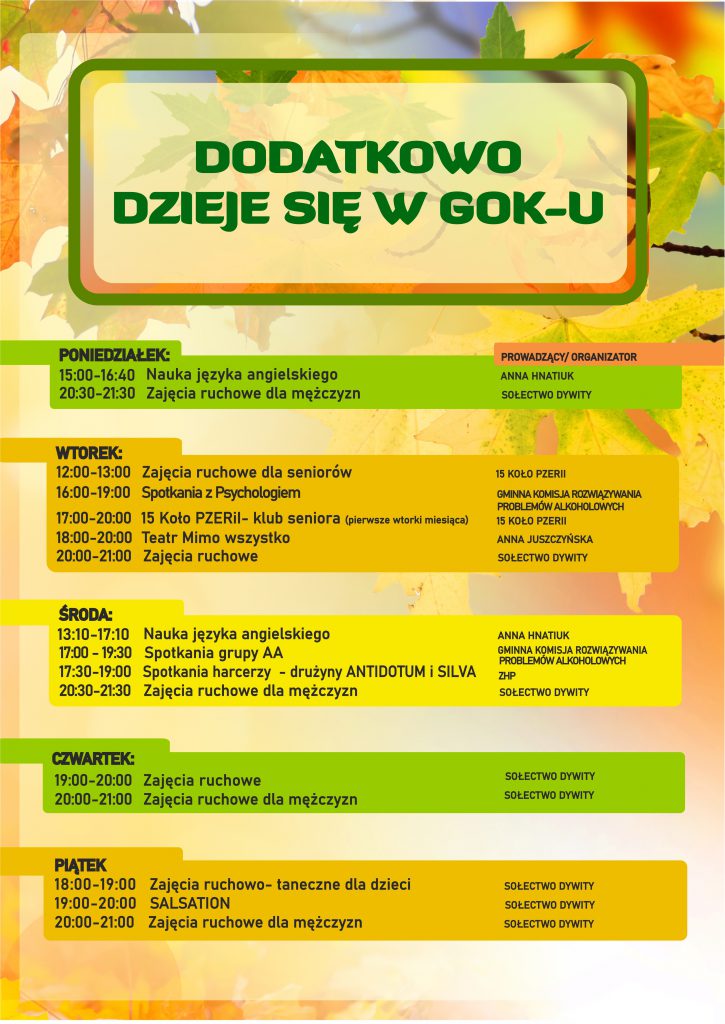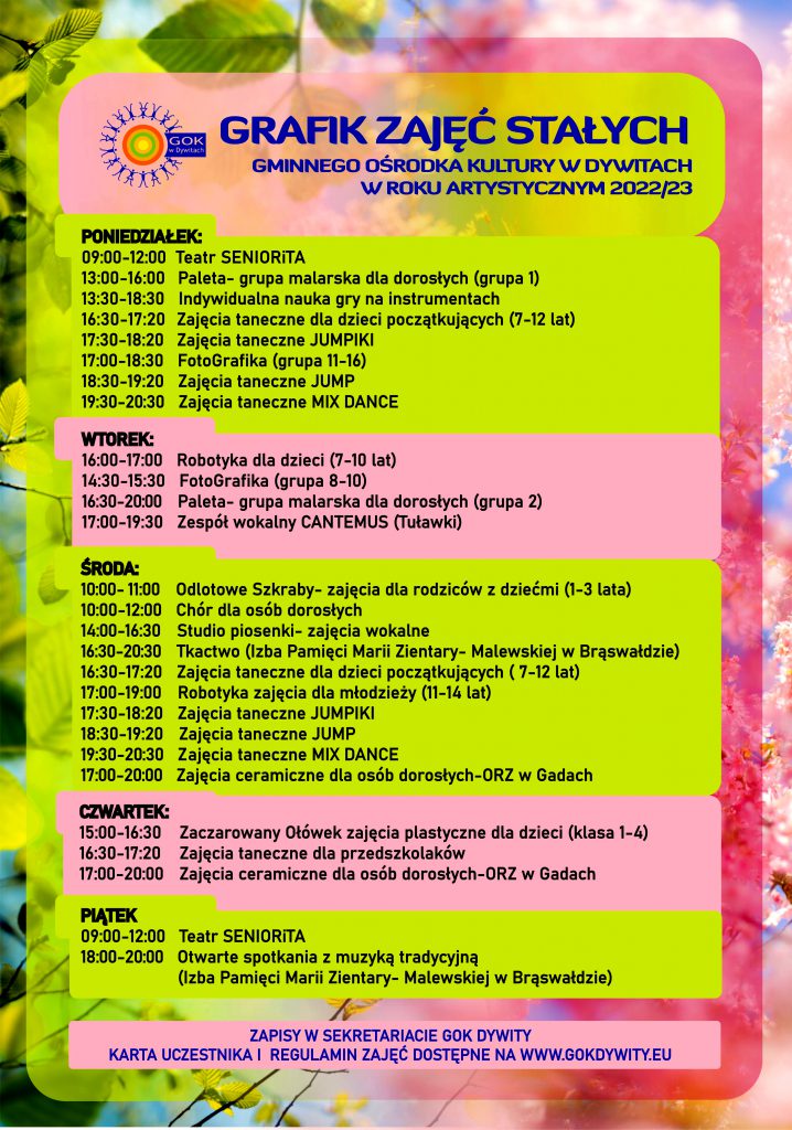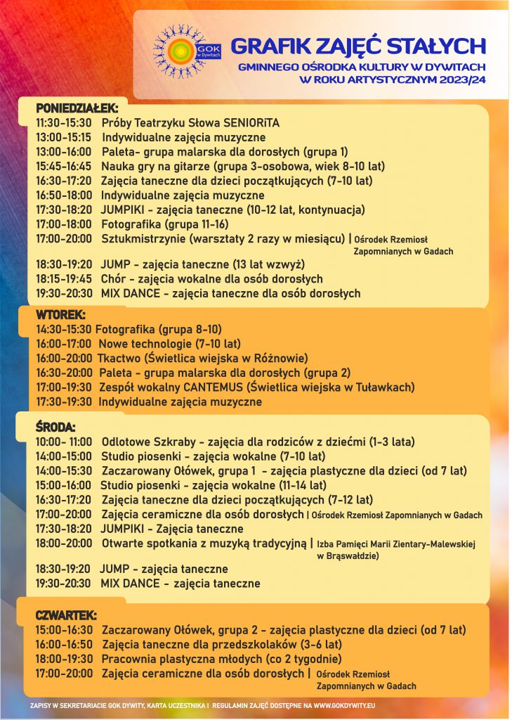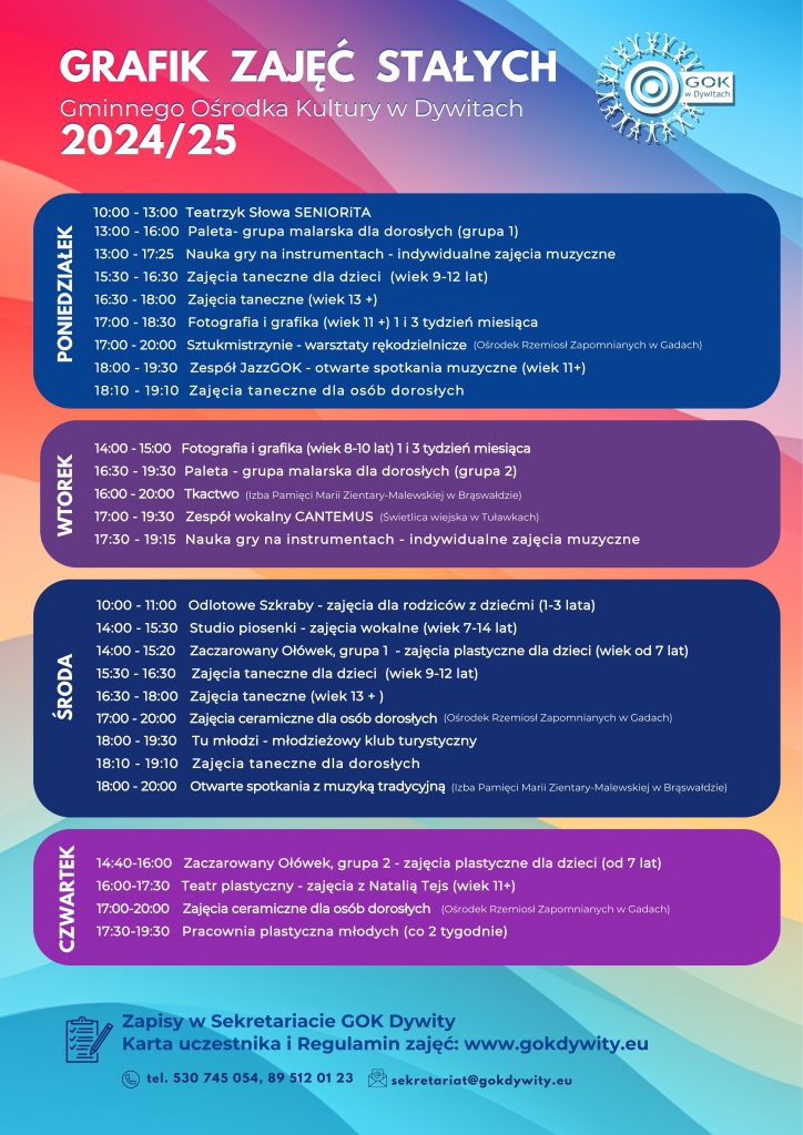 W przypadku zapisu uczestnika na dwa rodzaje zajęć stałych przysługuje zniżka 5%, trzy i więcej form zajęciowych- 10%. Zajęcia realizowane w ramach programu „Kulturalny ORLEN” – TAM Kultura „Twórcza Akademia Młodych”, trwające do końca roku 2025, są bezpłatne. Partnerem działań i projektów kulturalnych organizowanych przez Gminny Ośrodek Kultury w Dywitach jest @grupaORLEN. Warsztaty prowadzone przez Gminny Ośrodek Kultury w Dywitach są odpłatne, cena warsztatów uzależniona jest od rodzaju i techniki warsztatu. GOK Dywity nie posiada jednego cennika opłat za warsztaty. Płatności za udział w zajęciach dokonać należy najpóźniej do 10 dnia danego miesiąca. Opłaty należy dokonać przelewem na konto: citi handlowy 20 1030 1508 0000 0008 2362 7000 |