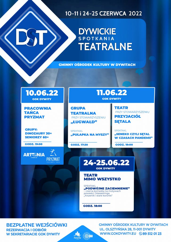 | Amatorska Grupa Teatralna Mimo Wszystko powstała w 2006 roku z inicjatywy Anny Juszczyńskiej, animatorki kultury. Od tego roku siedzibą teatru jest GOK w Dywitach. Grupa ma za sobą liczne premiery wystawiane w województwie i powiecie olsztyńskim. Spektakle powstały w oparciu o własne scenariusze i reżyserię. Na przestrzeni czasu zmieniał się skład zespołu, lecz niezmienna jest pasja do sztuki teatralnej, która łączy nas od lat. Obecnie zespół liczy ośmiu amatorów-aktorów, z zawodu nauczycieli i pedagogów. Każda osoba jest wyjątkowa, pełna pomysłowości, niesamowitego zaangażowania i sprawia, że teatr nasz widzimy ogromny! Podczas tegorocznych Dywickich Spotkań Teatralnych będzie miała miejsce premiera pełnej ironicznego humoru czarnej komedii, pt. „Podwójne zaciemnienie” na motywach powieści J.Kesselringa „Arszenik i stare koronki”. |