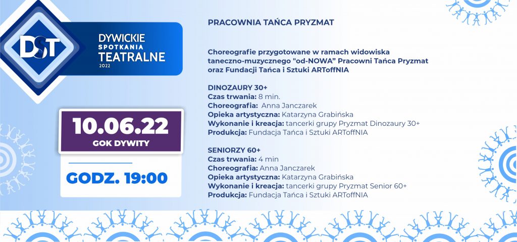 GRUPA SENIORZY 60+ Choreografia: Anna Janczarek Opieka artystyczna: Katarzyna Grabińska Produkcja: Fundacja Tańca i Sztuki ARToffNIA Wykonanie i kreacja: tancerki grupy Pryzmat: Krystyna Wilczewska, Teresa Wiśniewska, Irena Firlej, Elżbieta Markiewicz, Henryka Noskiewicz, Zofia Wieczerzak, Eulalia Pukis, Krystyna Konopielko,Alina Deptuła, Grażyna Nikiel |
