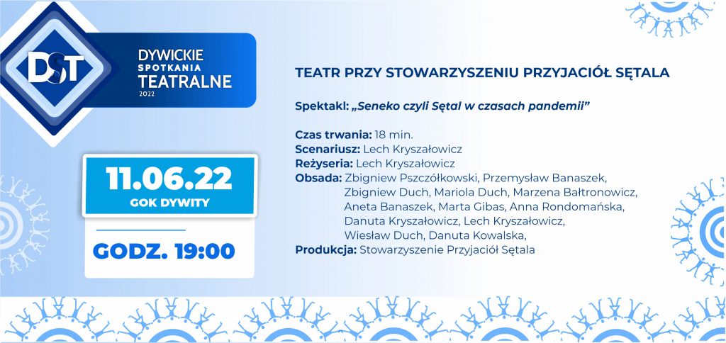| Jeszcze nie dawno każdy serwis informacyjny w mediach zaczynał się od informacji na temat COVID19. Nic więc dziwnego, że ten temat wziął na warsztat istniejący siedem lat Teatr Sętal. Temat podpowiedziało więc samo życie, a formę sętalska tradycja teatralna. Niemal każde jego przedstawienie ma formę zebrania wiejskiego. W najnowszym przedstawieniu sętalacy zatem na zebraniu znowu postanawiają wziąć sprawy w swoje ręce i znaleźć lekarstwo na COVIDa. Tekst jest, jak poprzednio, rymowany, dużo w nim lokalnych smaczków, kilka faktów historycznych, a nawet odniesień do poprzednich przedstawień. Czy sętalakom udało się wyprodukować lekarstwo na COVIDa i czy aktorsko sprostali wyzwaniu? Przekonacie się podczas Dywickich Spotkań Teatralnych. Zapraszamy też do oglądania tej sztuki na YouTube, wystarczy w wyszukiwarce wpisać: setalseneko. |