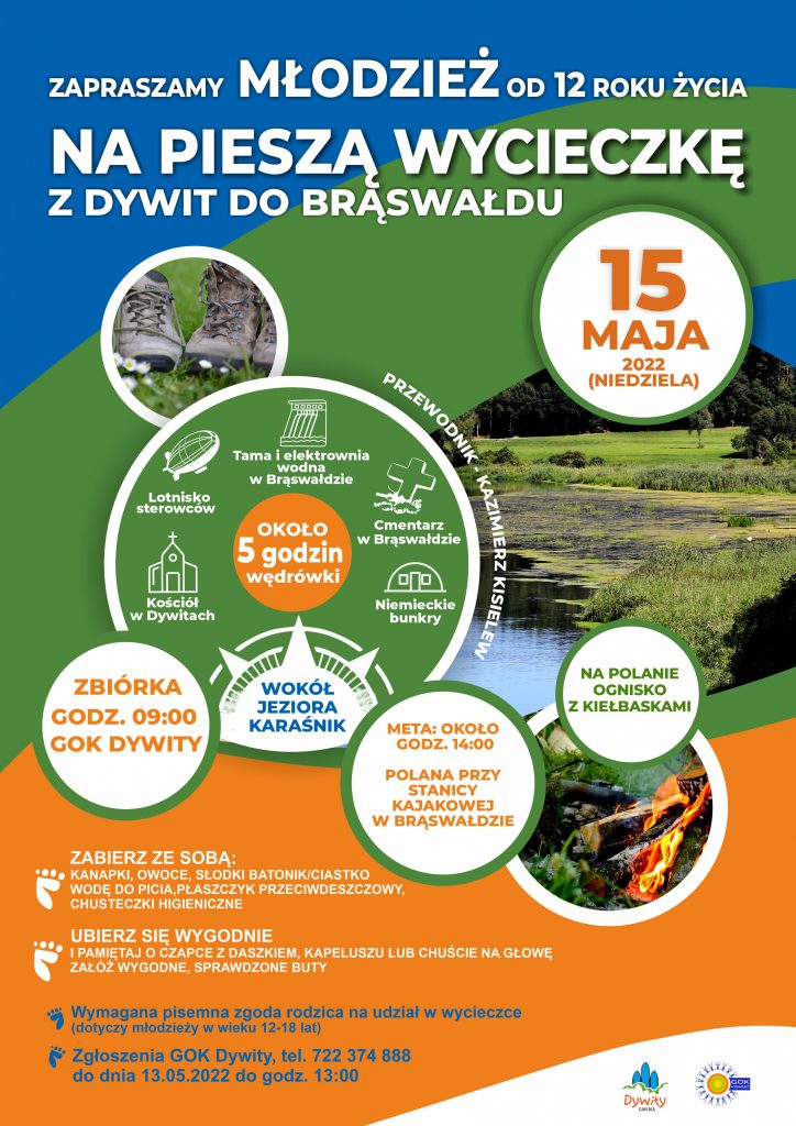 Zapraszamy młodzież od 12 roku życia do udziału w pieszej wycieczce z Dywit do Brąswałdu wokół Jeziora Karaśnik!
