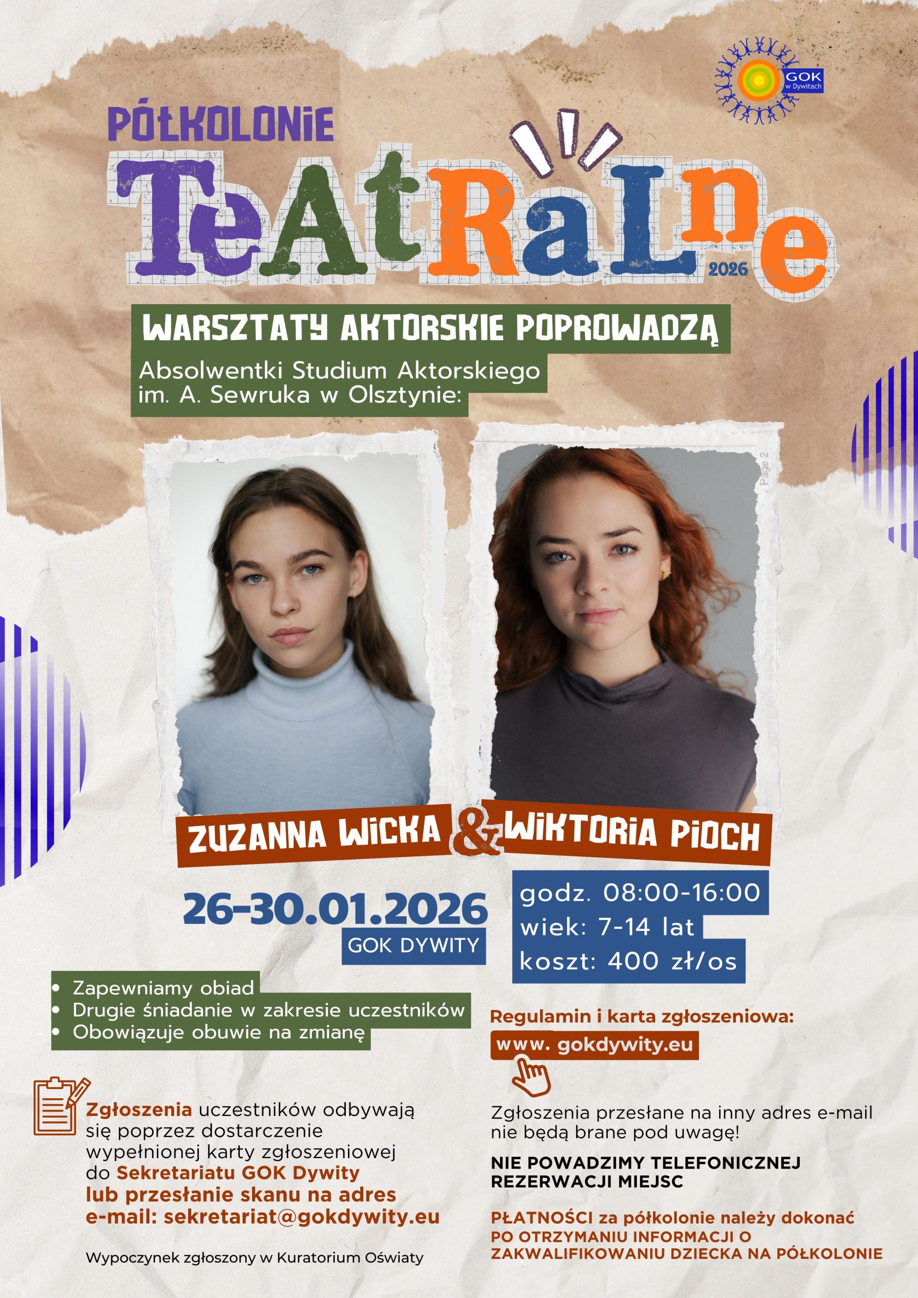Zgłoszenia uczestników odbywają się poprzez dostarczenie wypełnionej karty zgłoszeniowej: Karta_uczestnika_Półkolonie_Teatralne_2026