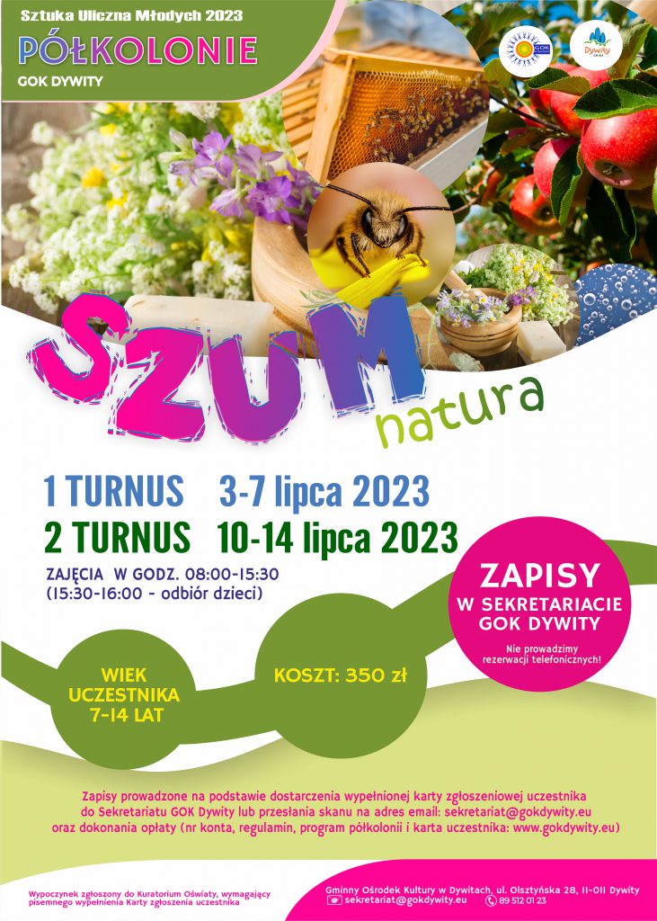 Zapraszamy dzieci i młodzież w wieku 7-14 lat do udziału w półkoloniach organizowanych przez Gminny Ośrodek Kultury w Dywitach. Na czas półkolonii zaplanowaliśmy szereg warsztatów oraz wycieczki, których tematem przewodnim będzie natura.