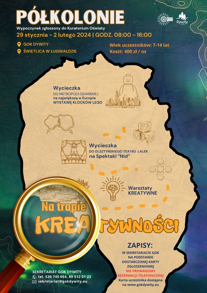 Zapisy na półkolonie od 15 stycznia 2024r. w sekretariacie Gminnego Ośrodka Kultury w Dywitach, na podstawie dostarczonej karty zgłoszeniowej.